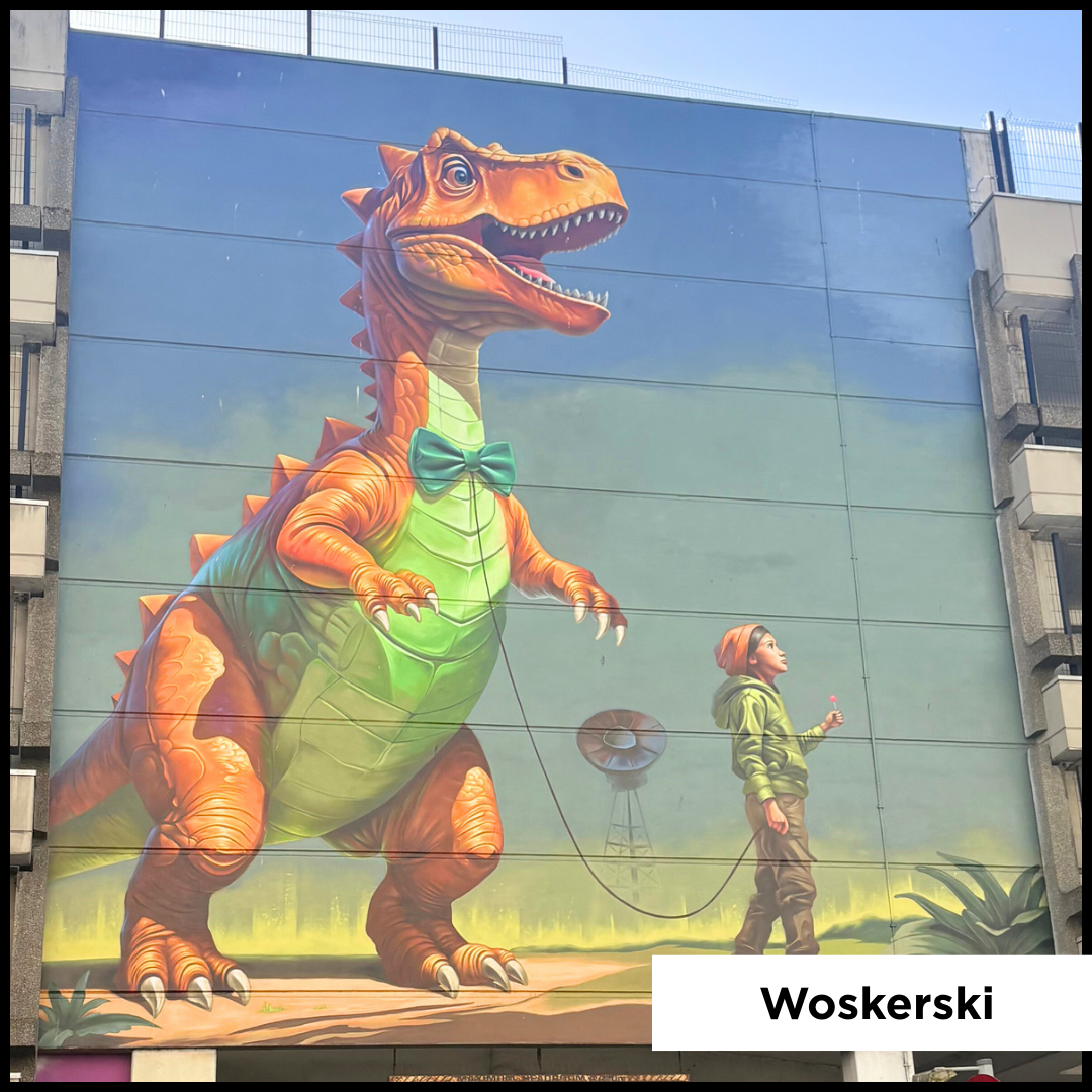Woskerski was born in 1983 and his artistic endeavours started in 1997 mostly with illegal graffiti but he soon began to take interest in other styles of painting. With a background in design he developed a versatile approach to artistry. His art integrates both reality and fantasy often depicted in vivid and vibrant colours. The choice of ironic and seemingly absurd characters often carry a relevant message. Woskerski’s aim is not only to create an aesthetically pleasing experience but also a thought-provoking artwork often infused with humour and irony sparking conversations on critical societal and environmental issues.