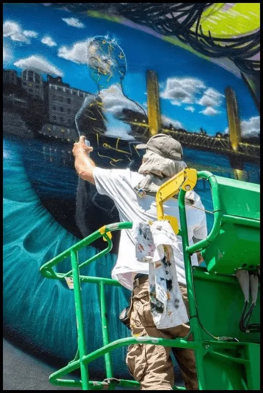 Concrete Canvas 2023: Take a closer look at the huge eye looking down on you from the side of Chelmsford Market and you will notice four characters reflected. These are The London Police who have been instrumental in creating Concrete Canvas and who have their own piece on Ladbrokes on the High Street. The iris of the eye itself is is from a macro shot of Market manager Kirsten, the musculature around the eye belongs to her daughter Lily.